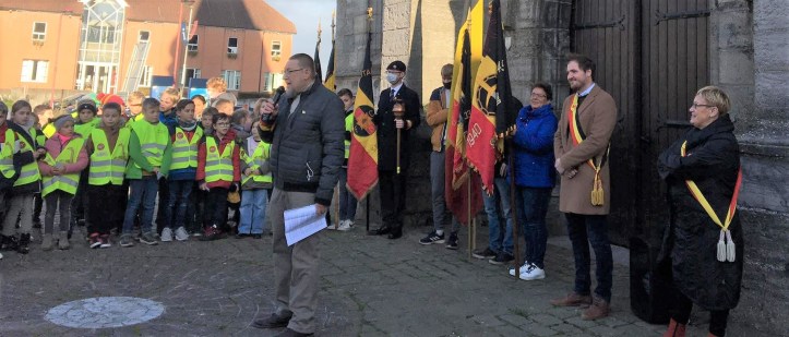 Nous voici présents sur ce parvis, 2 ans après notre dernière cérémonie anticipée de l’Armistice avec les Ecoles. Je crois que chacune et chacun, Mr le Bourgmestre, Mmes et Mrs les Echevins et Membres du Conseil, Monsieur le Doyen, Représentants des diverses associations patriotiques, Eleves et Ecoliers accompagnés de leurs professeurs, Représentants de la Police, Citoyens, chacune et chacun est ici avec cœur et respect pour tous ceux qui défendent le Liberté, au plus grand sens du terme ………..Que vous en soyez tous remerciés